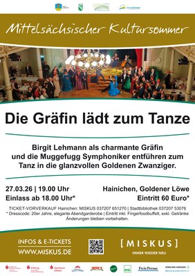 Dank Filmen wie „Babylon Berlin“ und „Der große Gatsby“ erleben die Roaring Twenties derzeit einen wahren Boom. Grund genug für den Mittelsächsischen Kultursommer, um zu einer rauschenden Ballnacht nach Hainichen in den prachtvollen Neorokokosaal des Goldenen Löwen einzuladen. Unternehmen Sie eine Zeitreise in die glamouröse Atmosphäre der goldenen 20er Jahre und spüren Sie dem ausgefallenen Lebensgefühl und der puren Lebensfreude dieser Jahre nach.